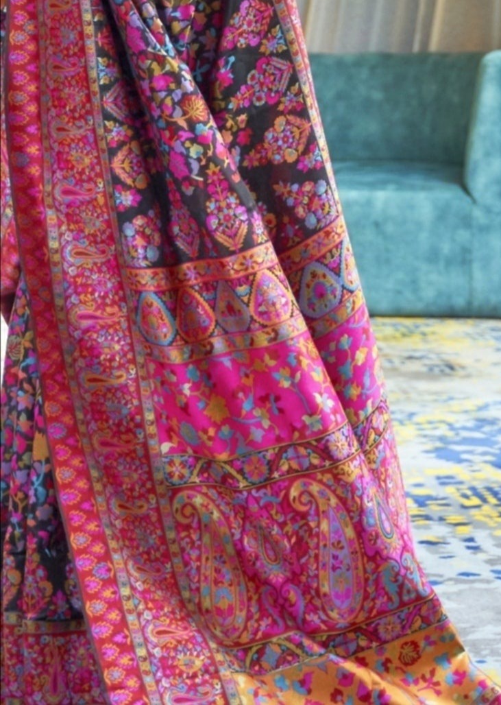 This is a beautiful and eye catching pure kashmiri handloom silk saree having floral motifs all over its body. It comes in a gorgeous and sensual black tone with a pink pallu. Perfect for the most intimate and special moments as well as casual outings, this pure original kashmiri silk sophisticated saree comes with a matching blouse piece.