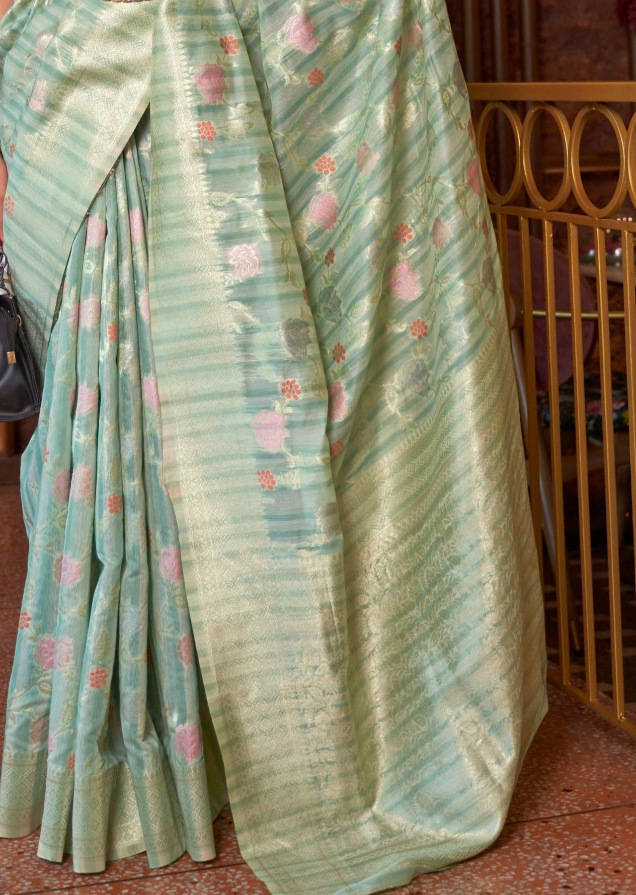 This pure handloom linen saree comes in a beautiful green colour. It has woven floral motifs on its body and intricate zari details on the pallu. It comes with a matching blouse piece. This pastel shade makes it an elegant pick. This is ideal for a minimalistic summer saree look.
