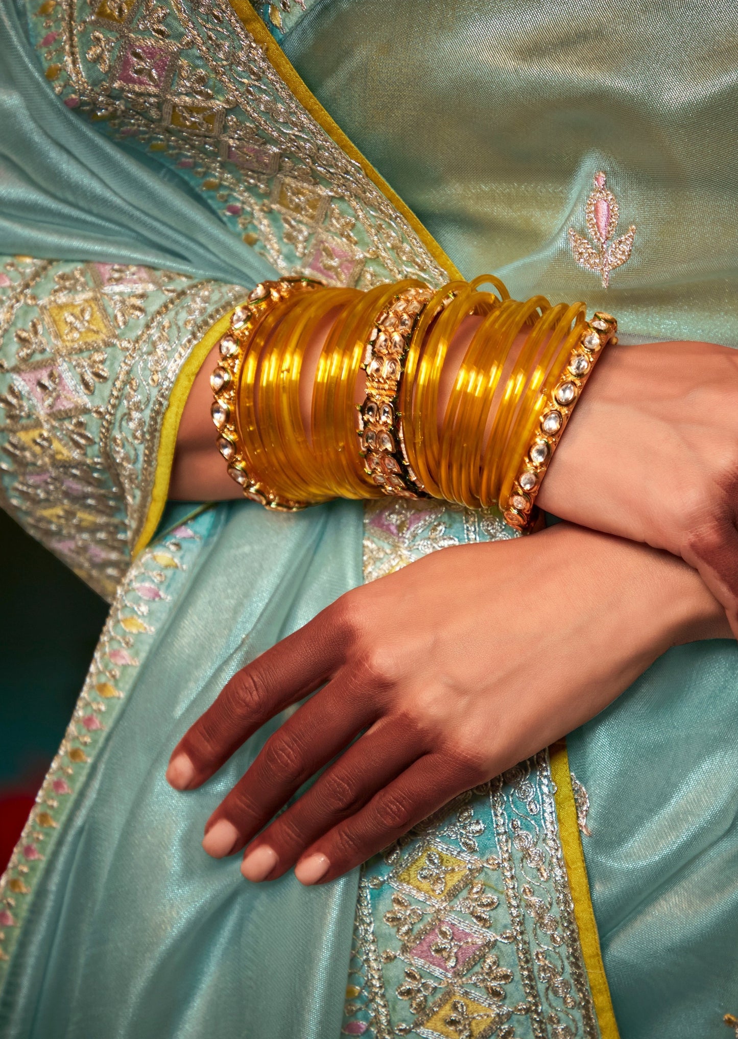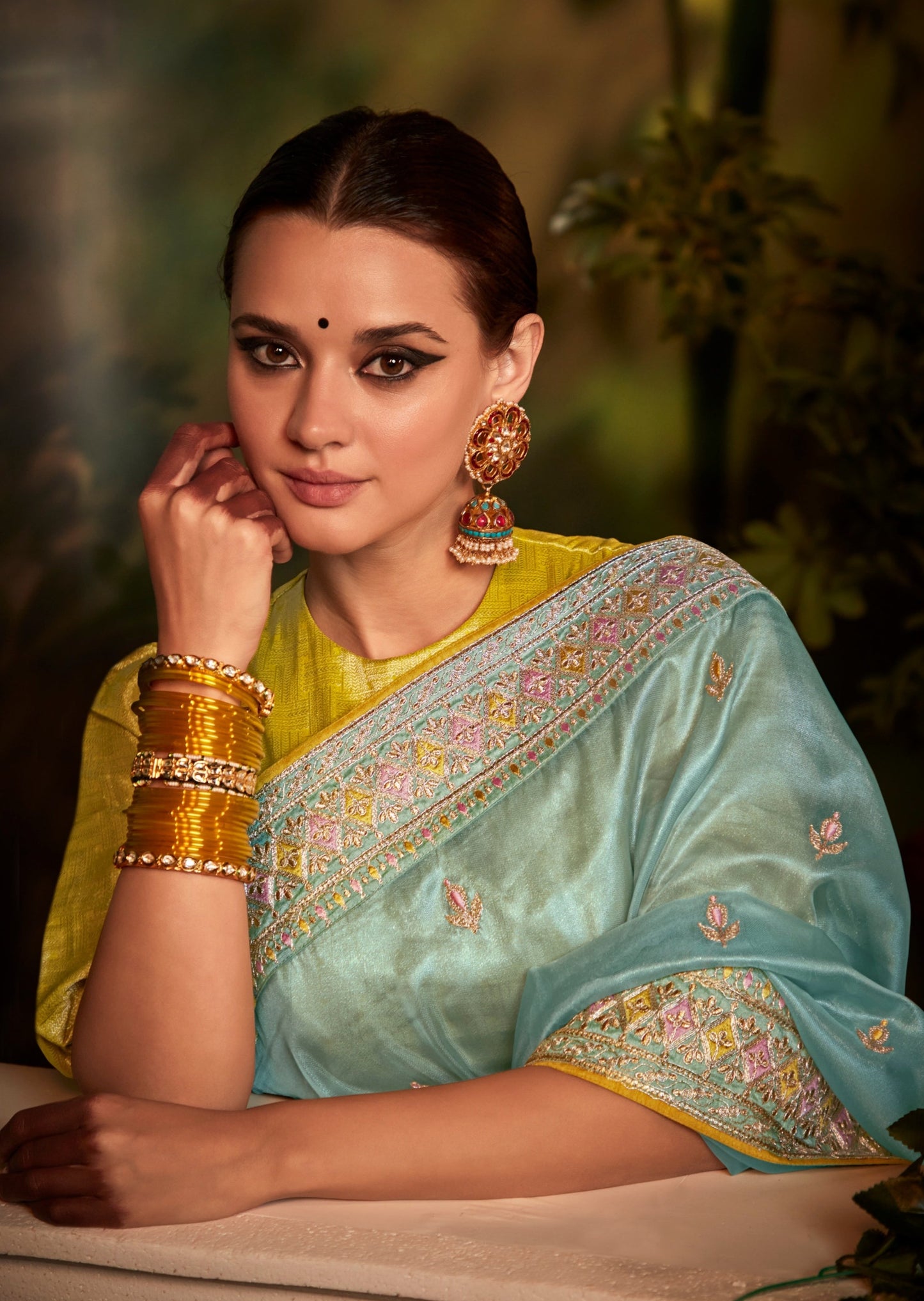 Styling tip: Style this beautiful organza saree with a chic clutch bag and statement jadau earrings and choker. Go for shimmer eyeshadow in a blush pink color and glossy coral lips. Pair it with stylish heels in gold colour. Finish the look with a low bun for a sensual look.