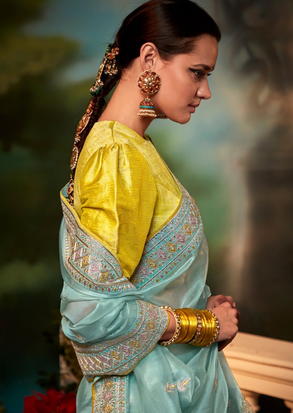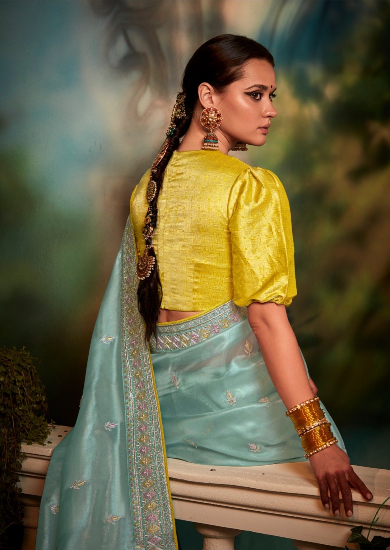 One of a kind saree from exclusive saree collection of our luxe edit, this partywear blue toned organza silk saree is a head turner. It comes with a contrasting blouse piece with heavy embroidery work. This saree has embroidered borders embellished with zari work, sequins work, heavy zarkan work, dori work and threadwork embroideries. This delicate pure organza saree with contrasting yellow banarasi blouse gives an elegant feminine feel.