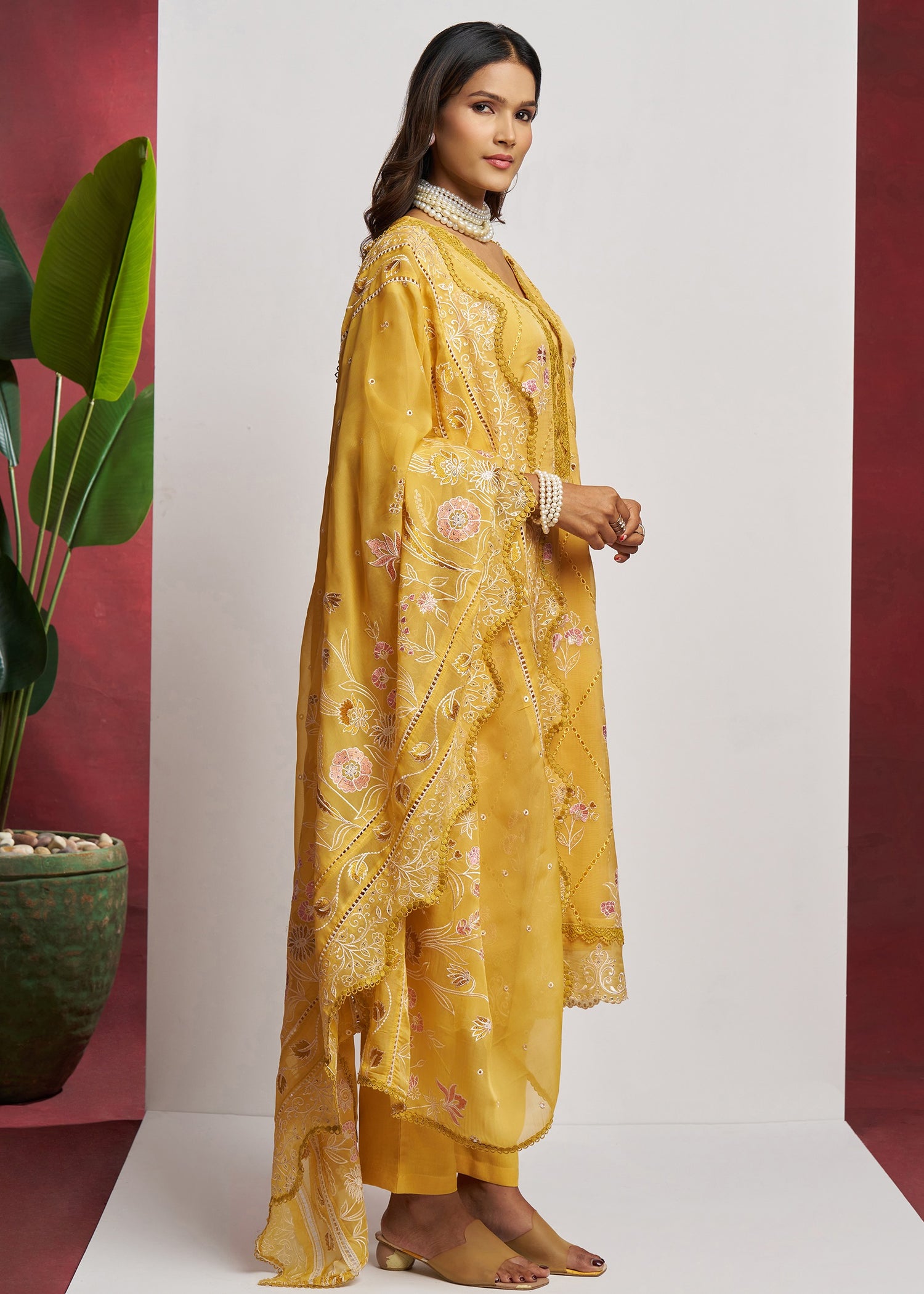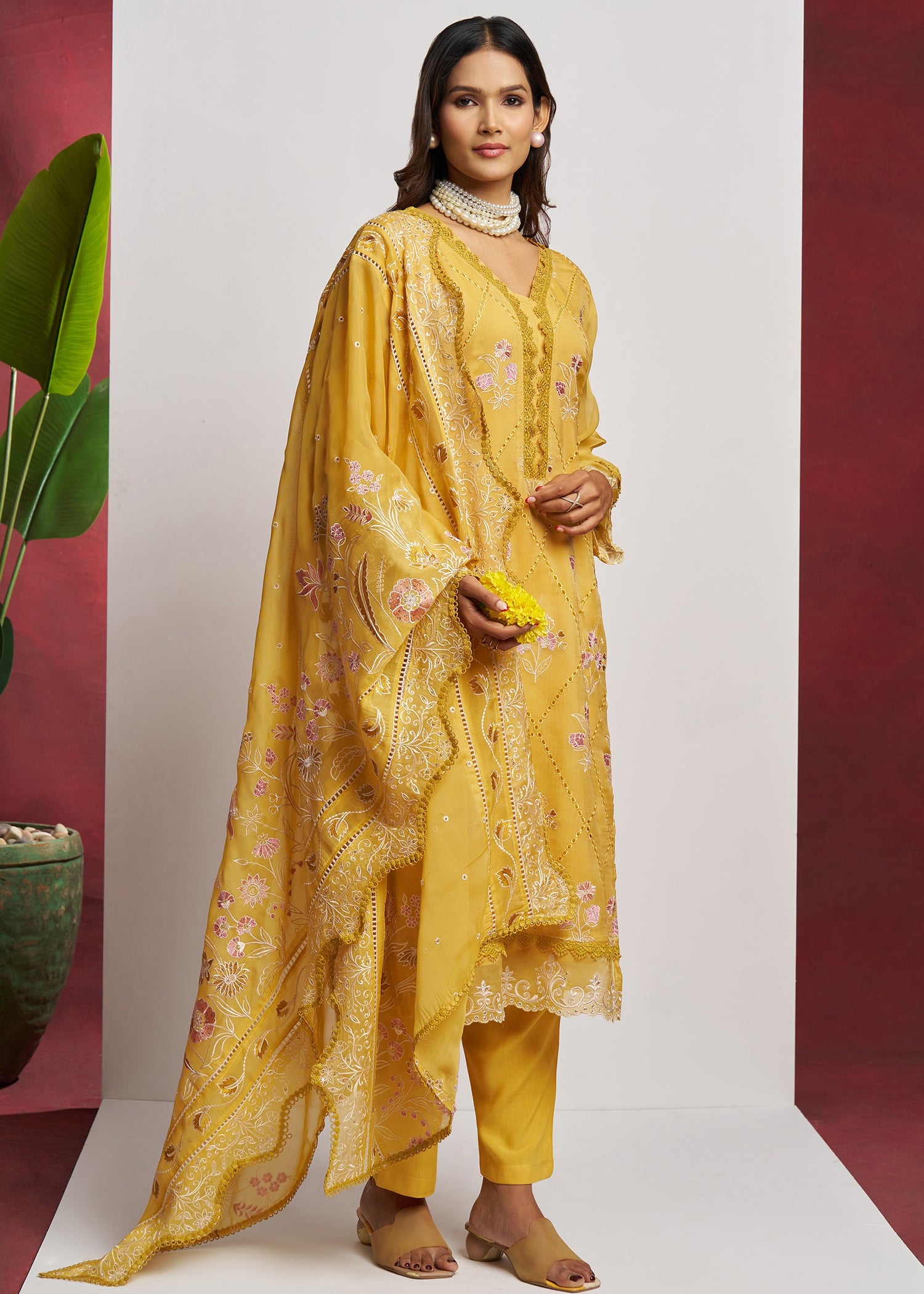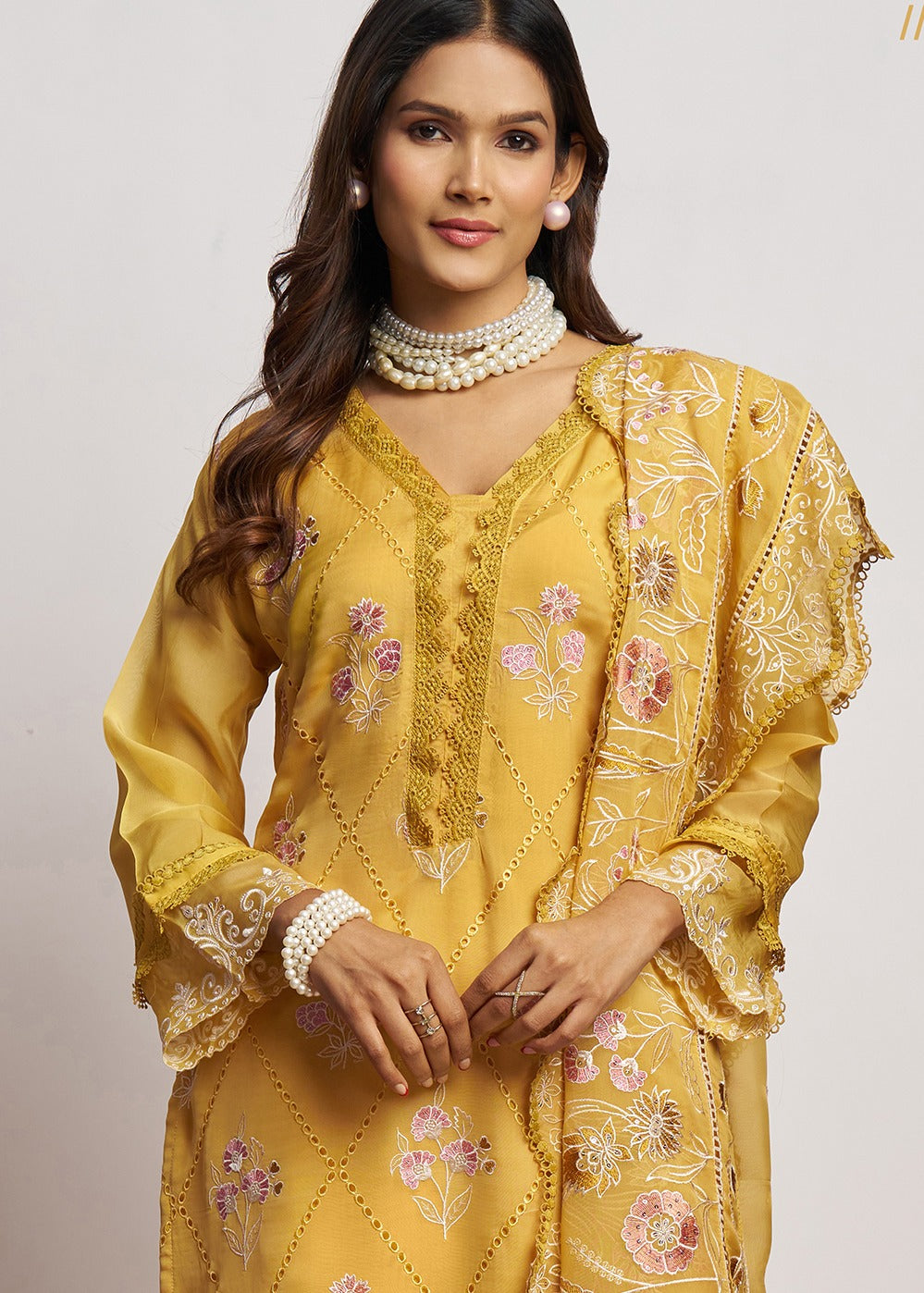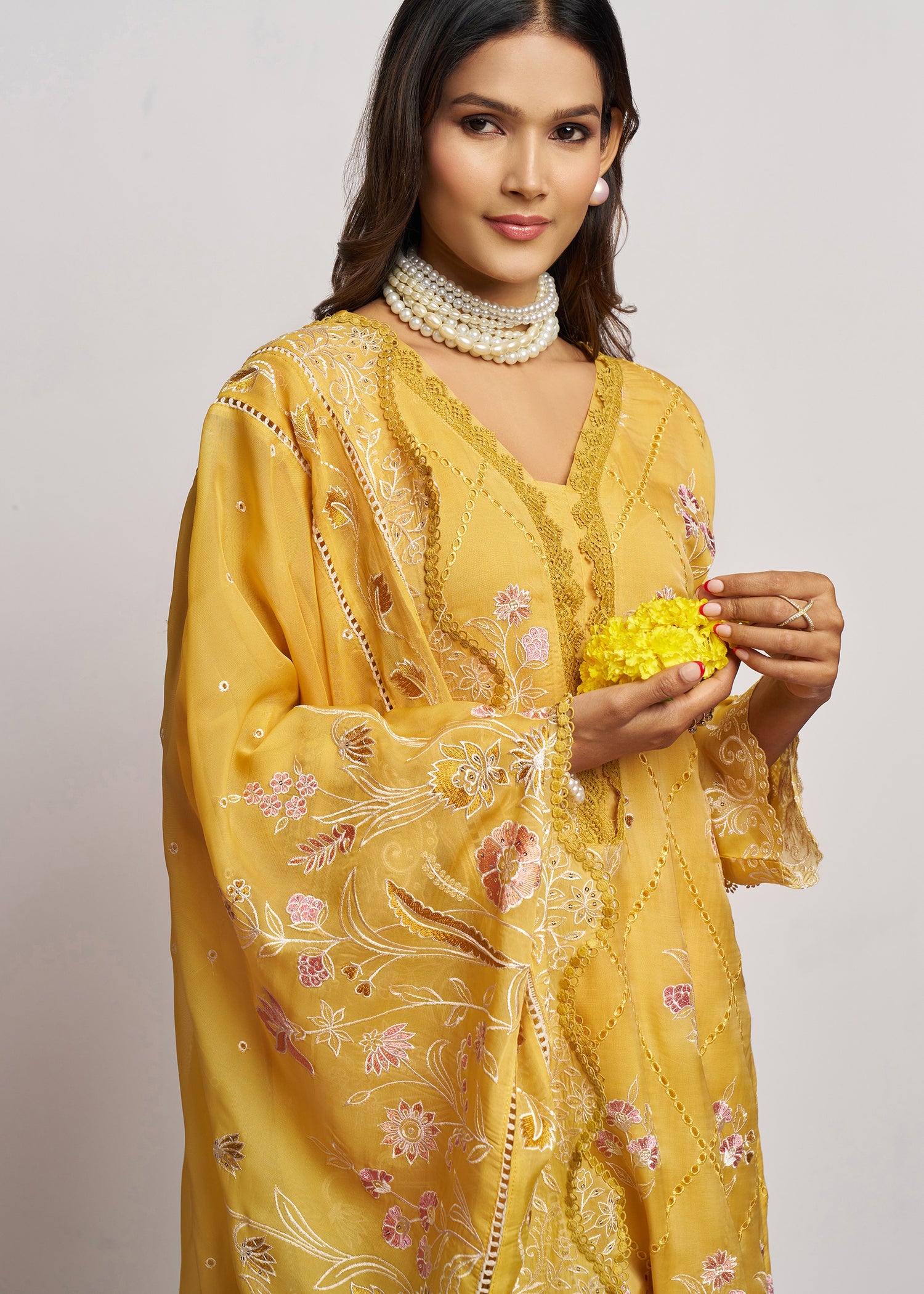 Pure Organza Yellow Unstitched Salwar Suit Set with Threadwork Embroidery