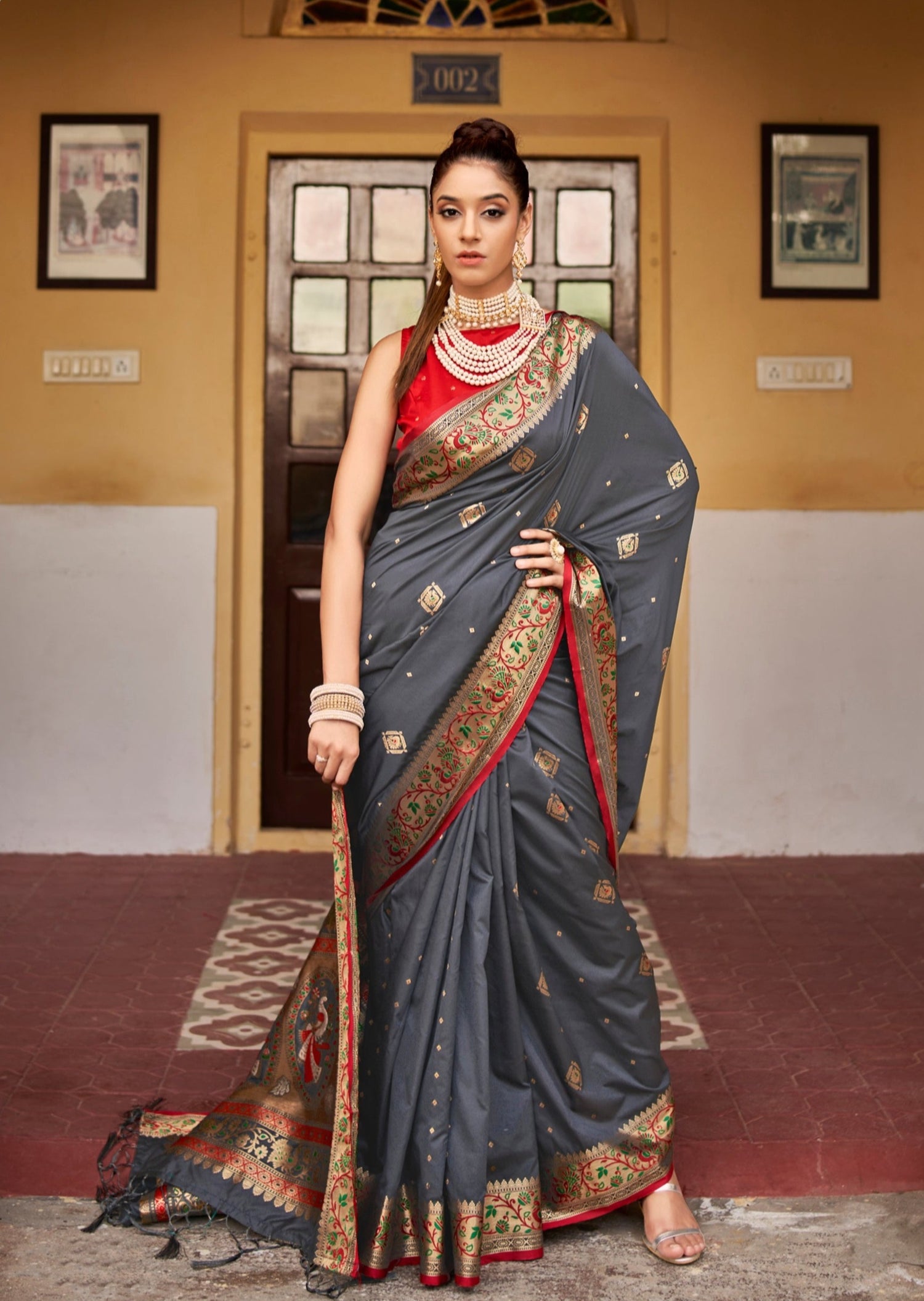 This gorgeous grey silk saree is traditional as well as stylish making it a must have statement saree. Its beauty is accentuated with the intricately done beautiful floral designs on the borders and peacock design pallu making it an ideal fit for special occasions like weddings, festivities and other ceremonies. The gold zari work having peacock design on the pallu makes it a chic saree to own and flaunt. It has beautiful and intricate gold zari booti details on the pleats. It comes with a contrasting blouse piece with heavy zari work on the sleeve border.