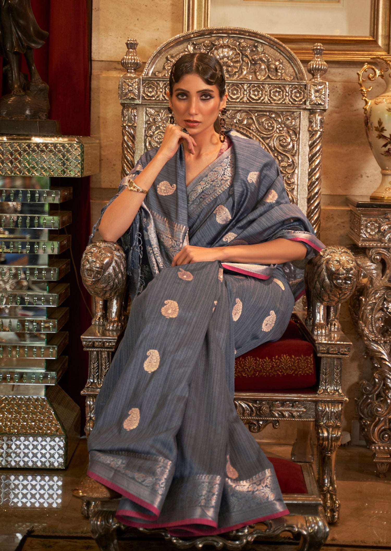 This gorgeous pure handloom tussar silk saree embellished with zari details is a must have in your ethnic wardrobe. Having a broad zari banarasi border adds on to its beauty. The boota and floral motifs on the pleats and borders give a beautiful finish to it. Exuberantly designed with splendid silk and a stunning maroon blouse, this grey toned handloom saree will surely make your gracious look more glorified.