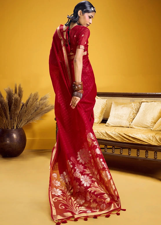 Red Muga Silk Handloom Weaving Saree | Gold Accents Floral Design