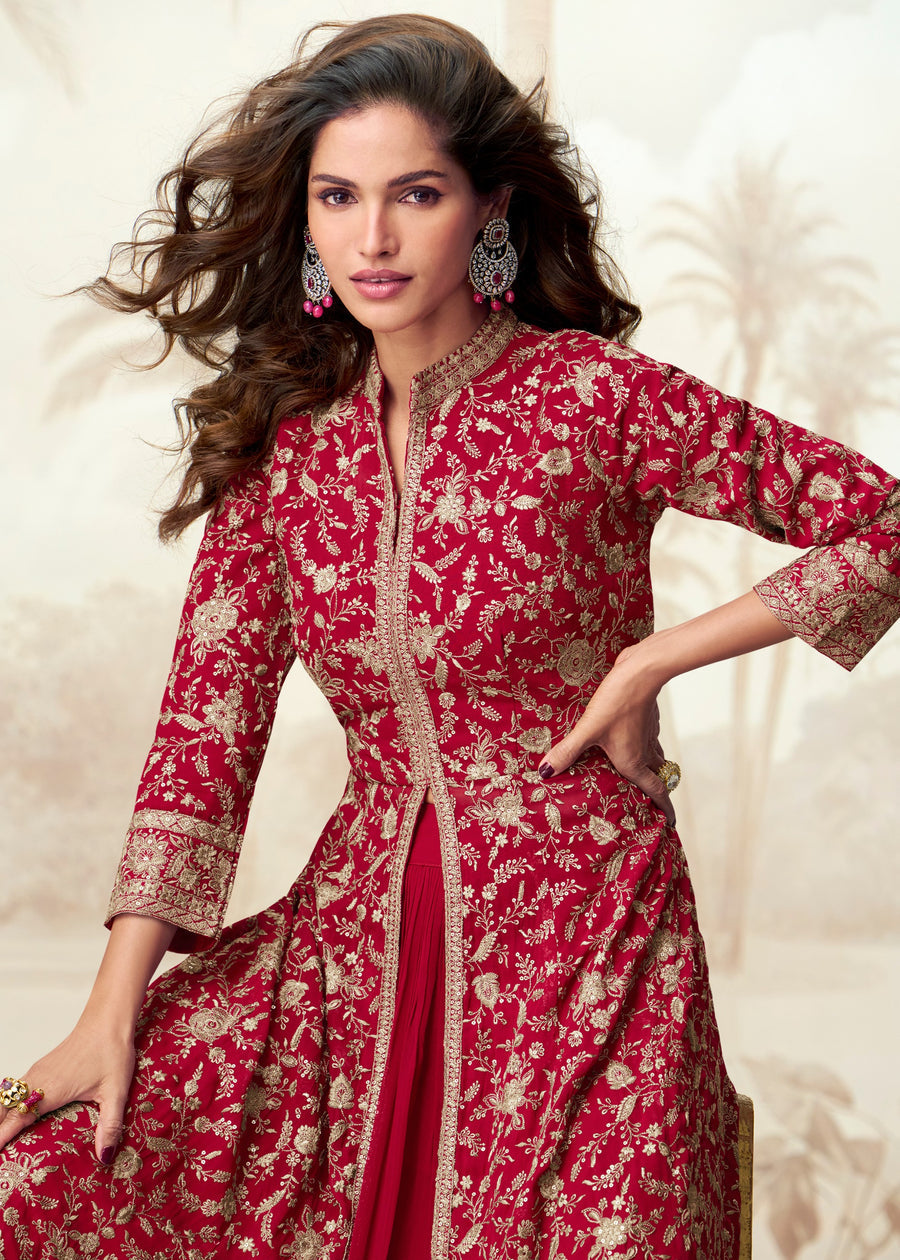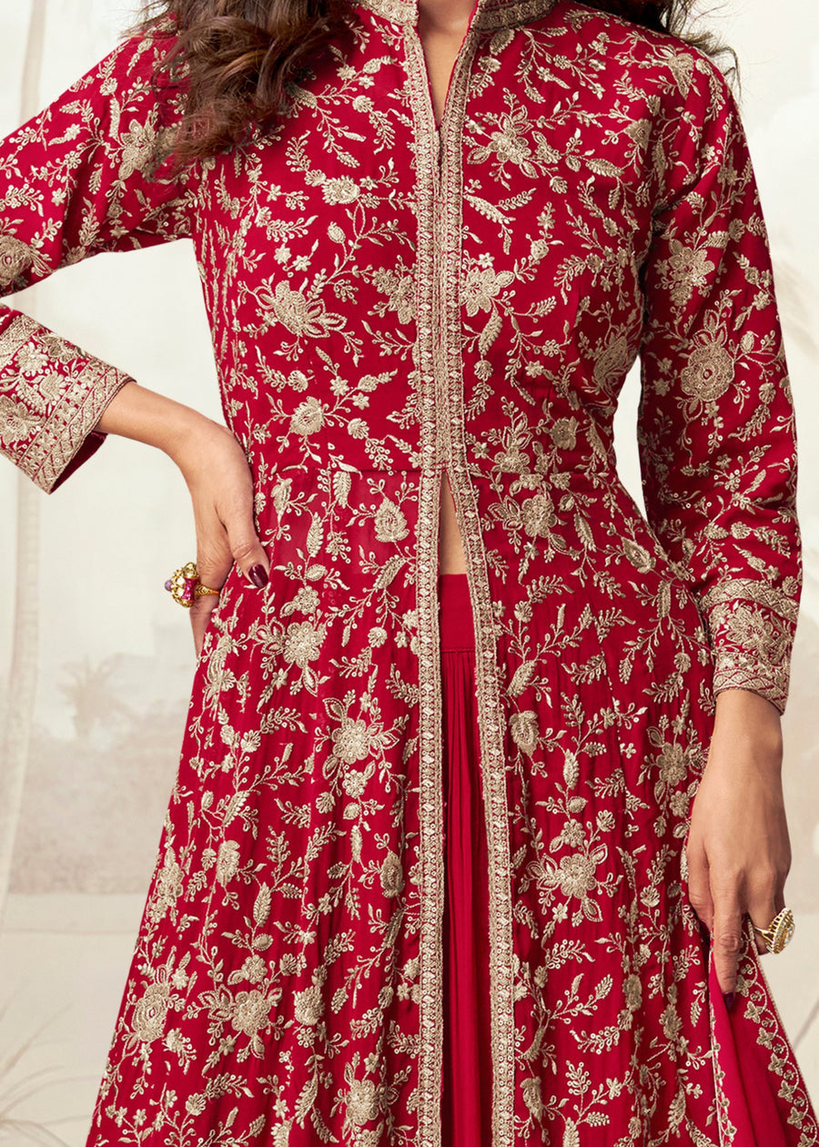 Red Readymade Jacket Style Anarkali Georgette Suit Set