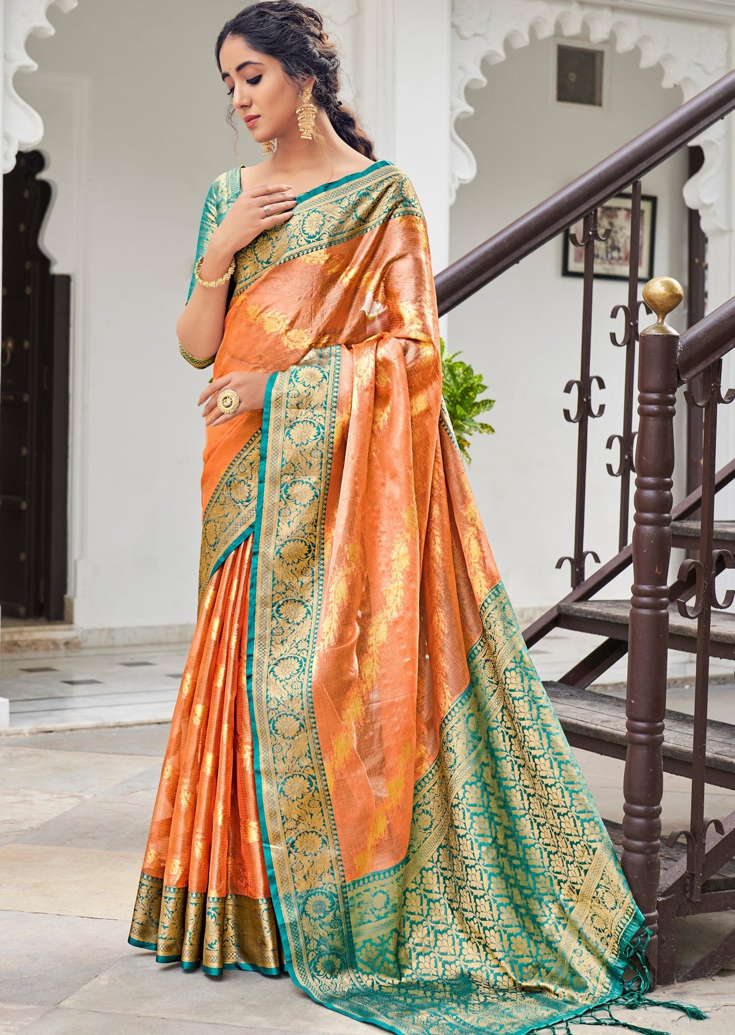 Beautiful banarasi tissue silk saree having a soft grace; this gorgeous peach saree comes with a regal zari woven blue blouse piece. It has gold woven bootas all over on the fabric. This bewitching beauty sings the tales of absolute femininity in the most chic manner. This tissue silk beauty has hues of blue and peach to give you the perfect vibrant look. The broad pallu and banarasi borders have gorgeous gold zari bootas.This saree is an ideal choice for all your festivities.
