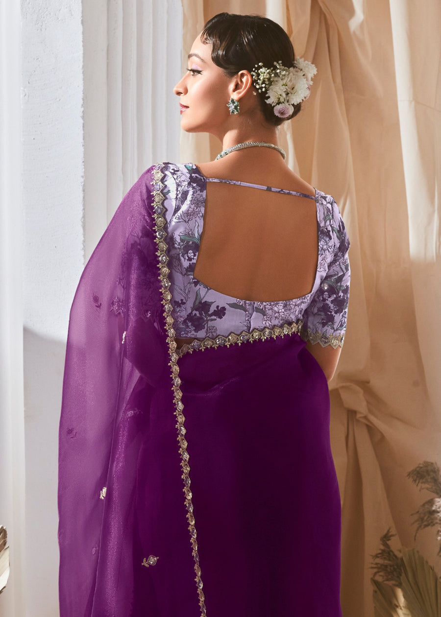 Violet Purple Organza Tissue Silk Embroidered Saree & Printed Blouse