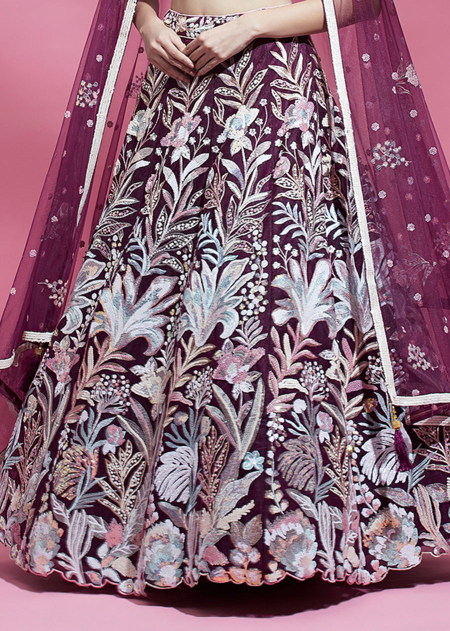 Wine Red Lehenga Choli With Sequins Embroidery For Bridesmaids