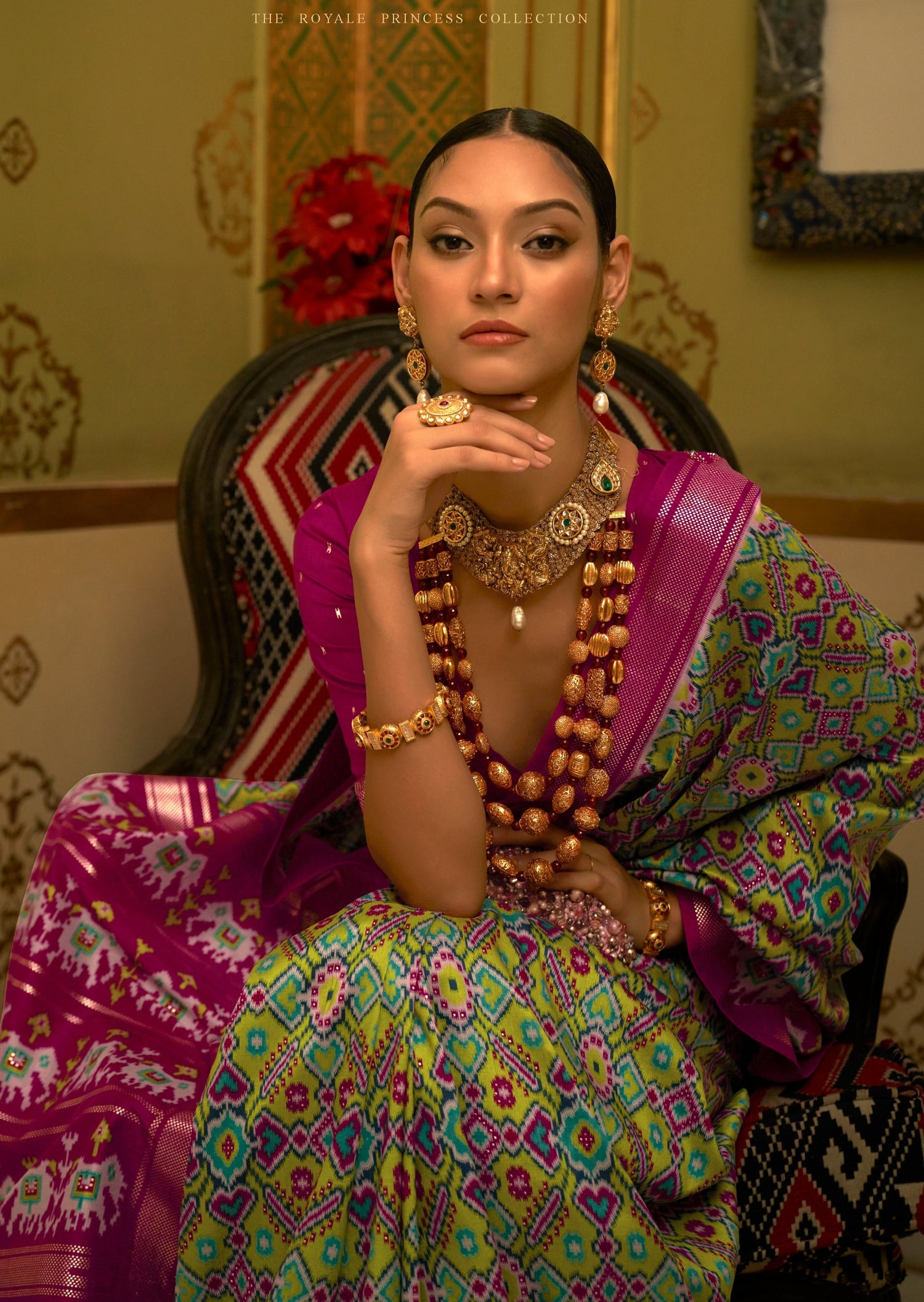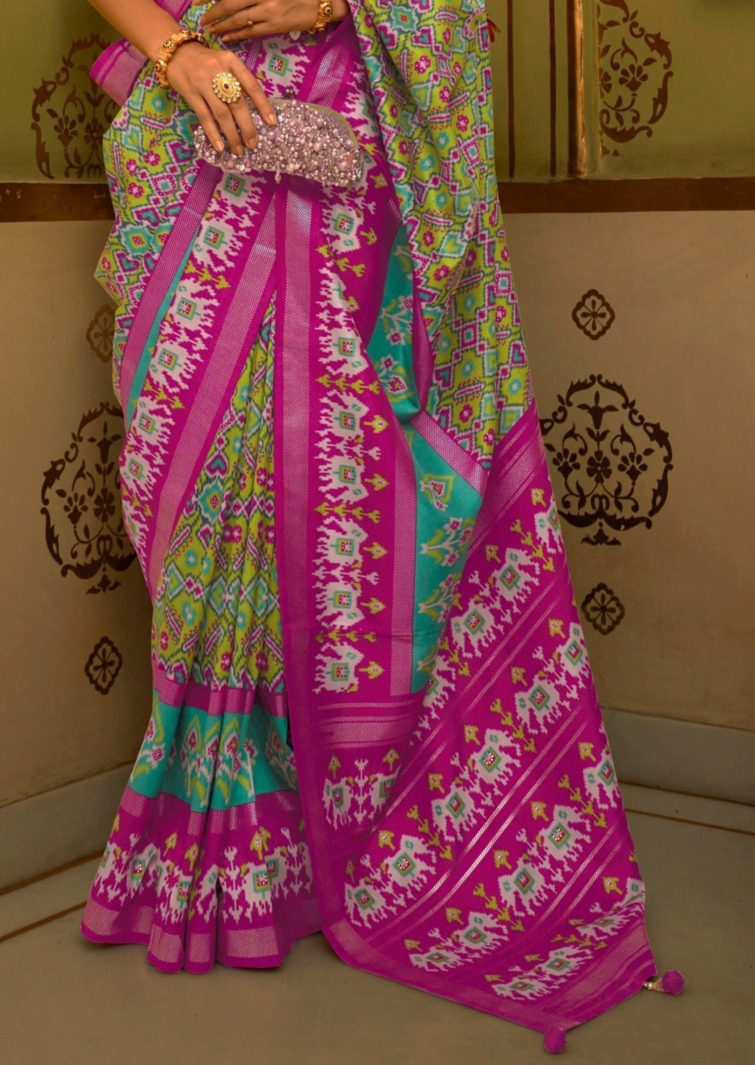 Presenting our exquisite and exclusive line of patola sarees - These luxurious silk fabrics are woven with precision and care, making them a true work of art. Perfect for special occasions, this patola silk ikat / ikkat saree with zari work and geometrical design is a perfect choice for festivals. It comes with a gorgeous blouse and vibrant pallu. Drape this beauty to bring out your inner feminine diva.