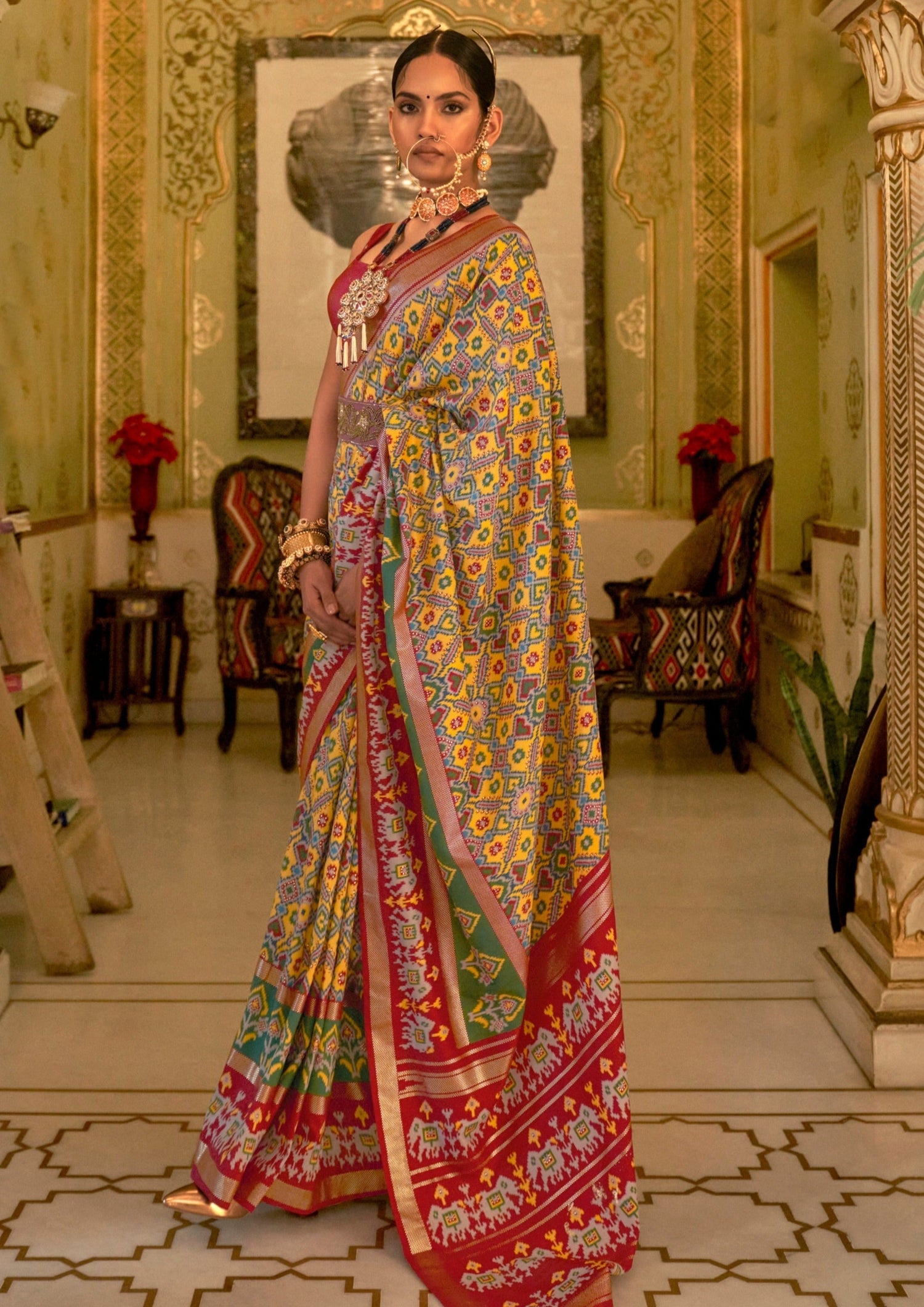 Presenting our exquisite and exclusive line of patola sarees - These luxurious silk fabrics are woven with precision and care, making them a true work of art. Perfect for special occasions, this patola silk ikat / ikkat saree with zari work and geometrical design is a perfect choice for festivals. It comes with a gorgeous blouse and vibrant pallu. Drape this beauty to bring out your inner feminine diva.