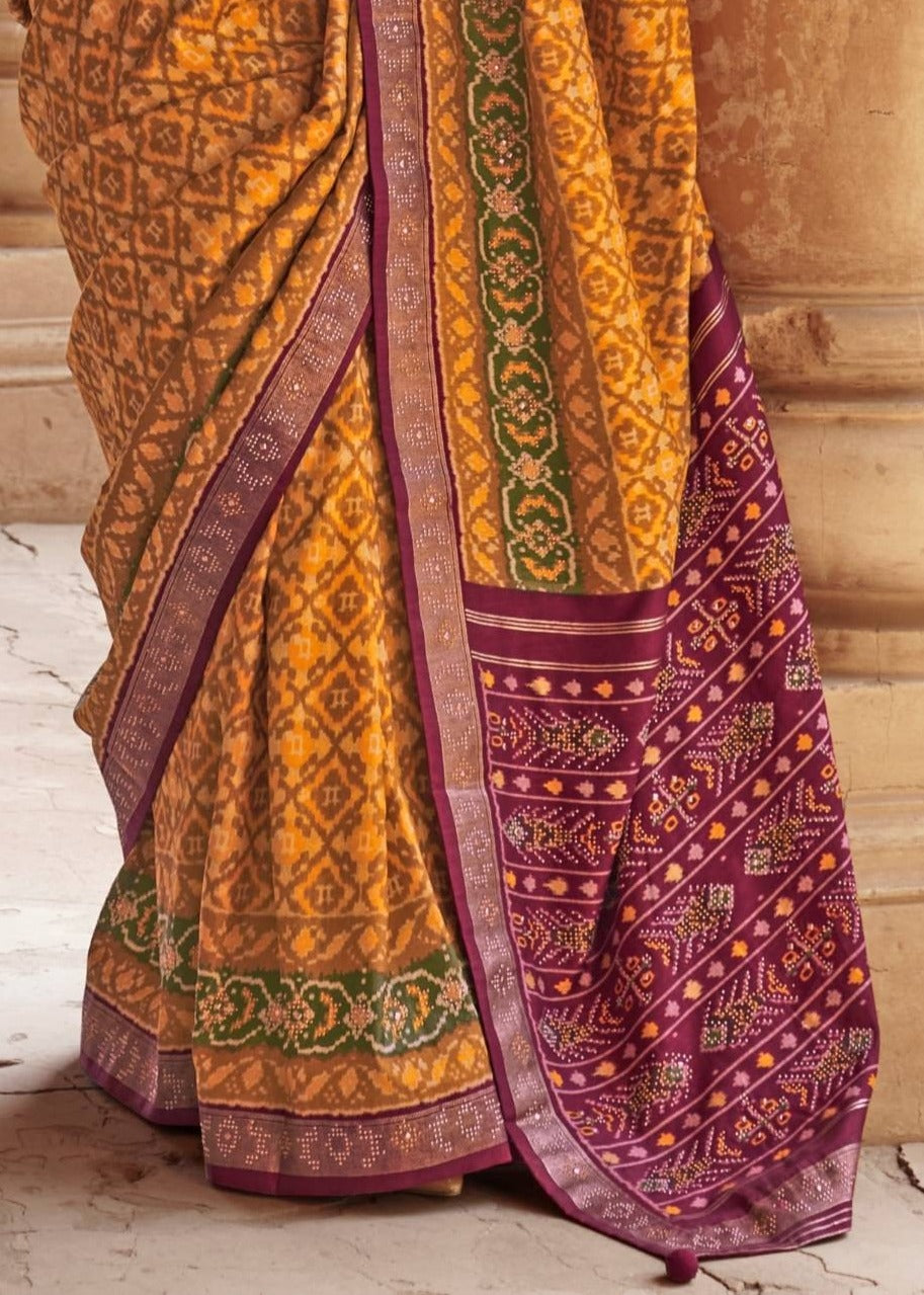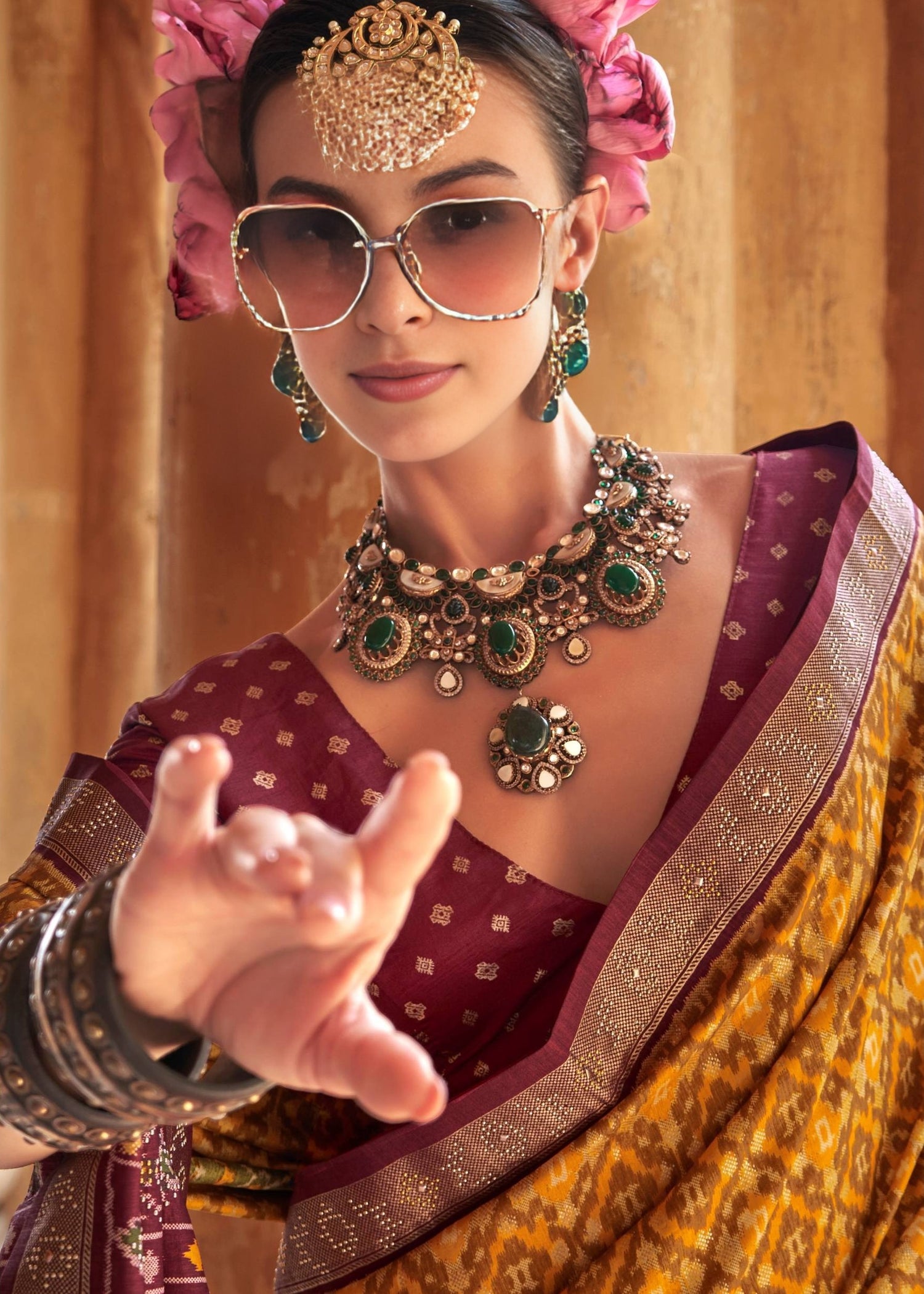 Yellow Designer Patola Silk Saree With Contrast Maroon Blouse